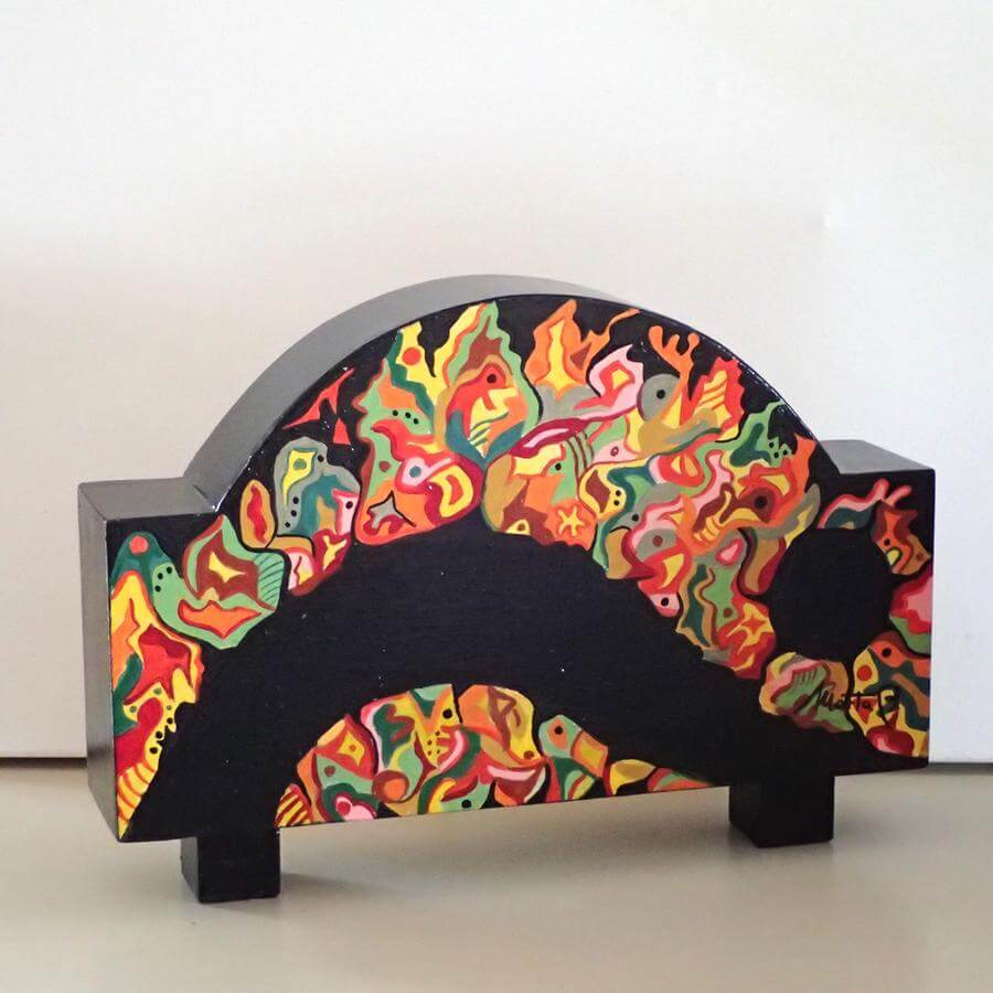 Με τα χρόνια έχω κατασκευάσει τραπεζάκια, βιβλιοθήκες, παραβάν, ρολόγια, λάμπες και άλλα αντικείμενα. Σε κάθε αντικείμενο που σχεδιάζω συναντιούνται η ζωγραφική, η μικρογλυπτική, το σχέδιο και τέλος, η συνολική μου ιδέα για την αρχιτεκτονική φόρμα. Mε συναρπάζει το γεγονός να παρέμβω σε αυτά τα κοινώς χρησιμοποιούμενα πράγματα με σχήματα και χρώματα. Μία ανάγκη που με ωθεί να δημιουργήσω πιο δραστικά ένα αποτύπωμα στον χώρο. Βιώνω την τέχνη μου σαν μία προέκταση του εσωτερικού μου κόσμου προς τα αντικείμενα, καθώς, ολοκληρωμένα πια, τοποθετούνται στον πραγματικό χώρο.